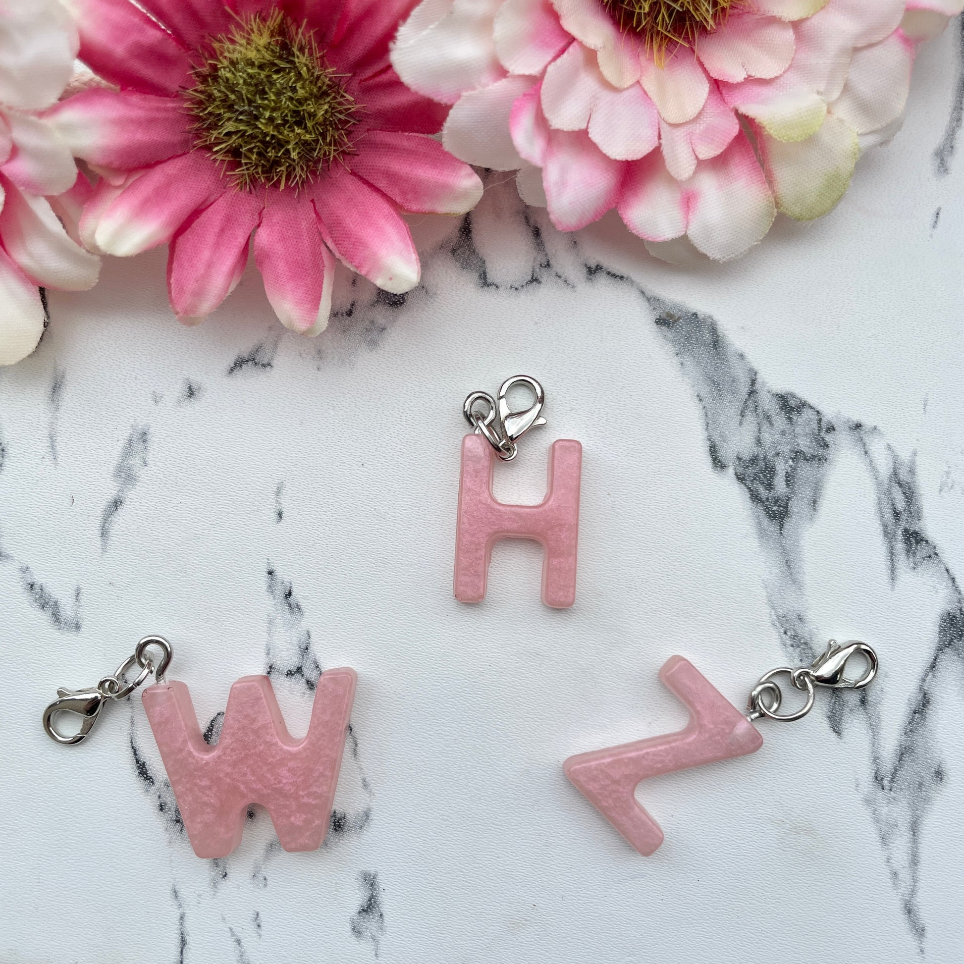 Small letter keychains made out of resin. These come without keychain rings which make them a perfect addition to any of the larger keychains.