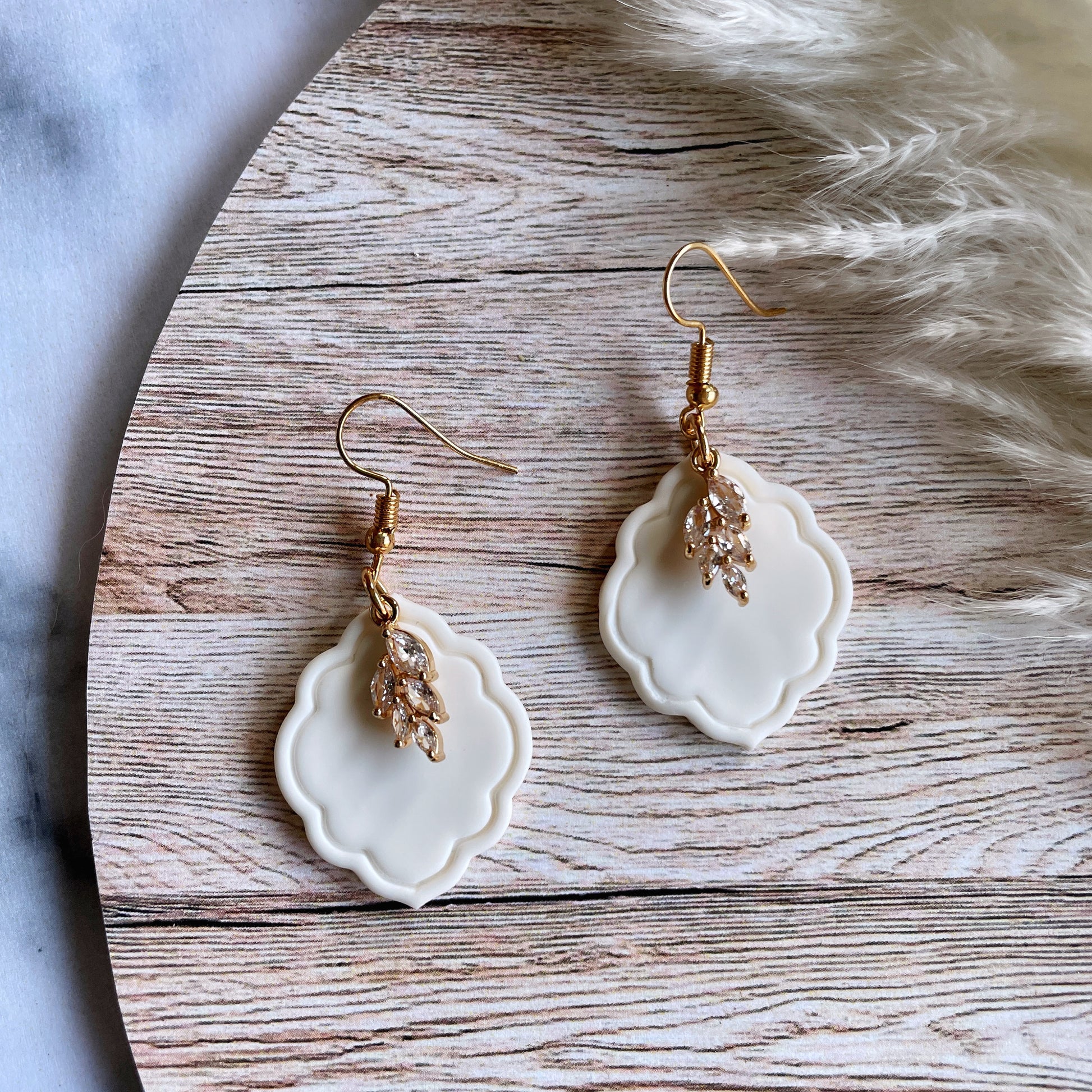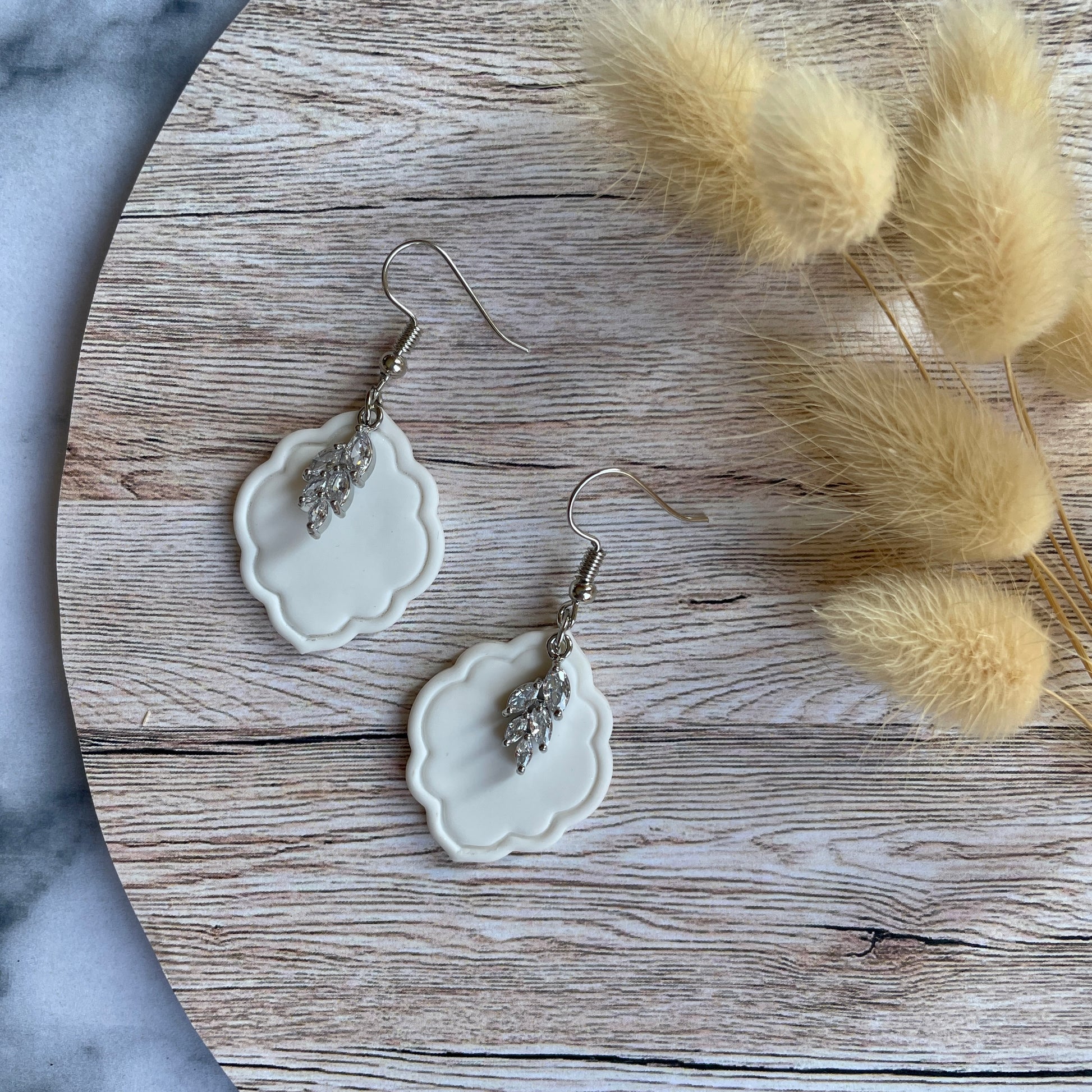 Statement polymer clay earrings on hooks with cubic zirconia pendant.