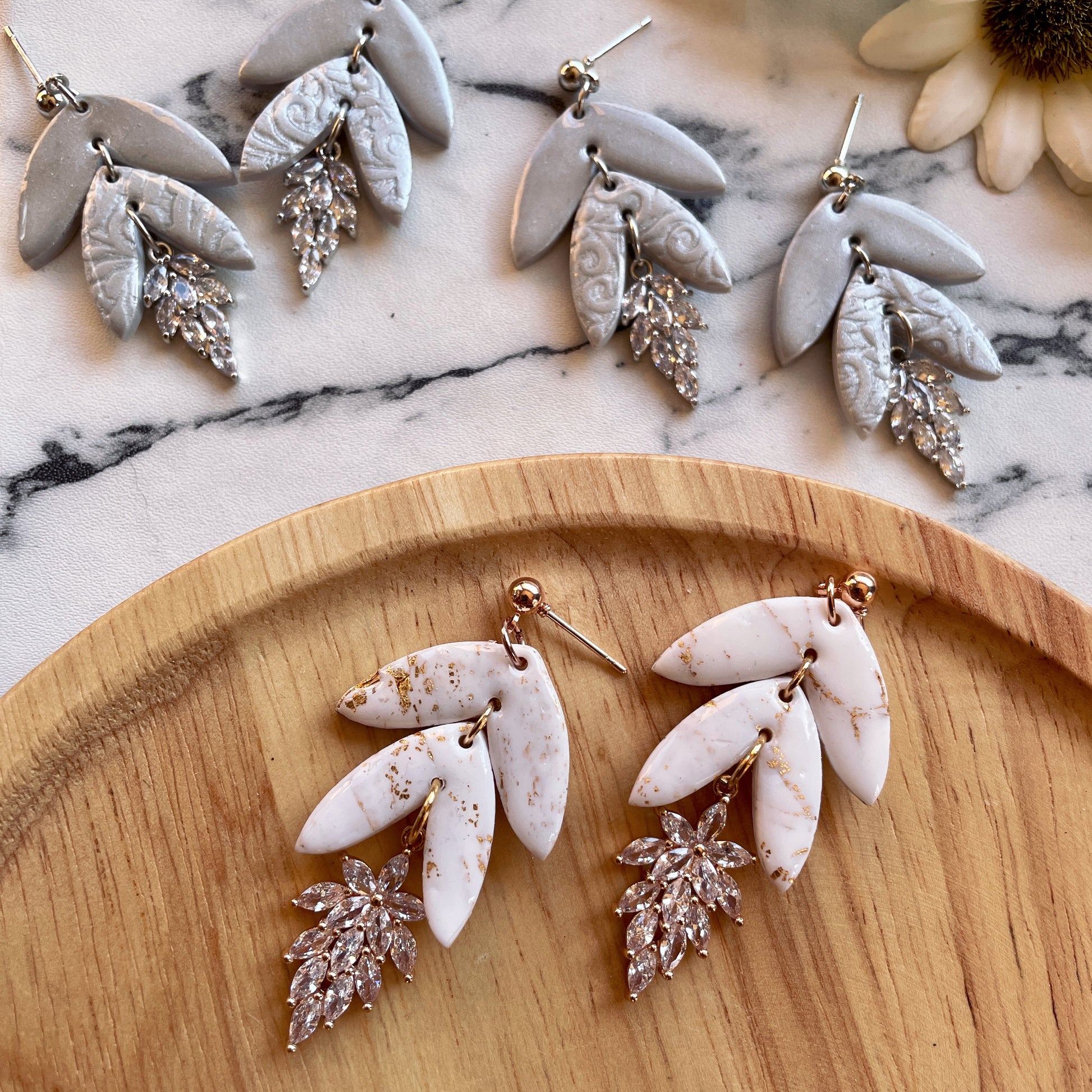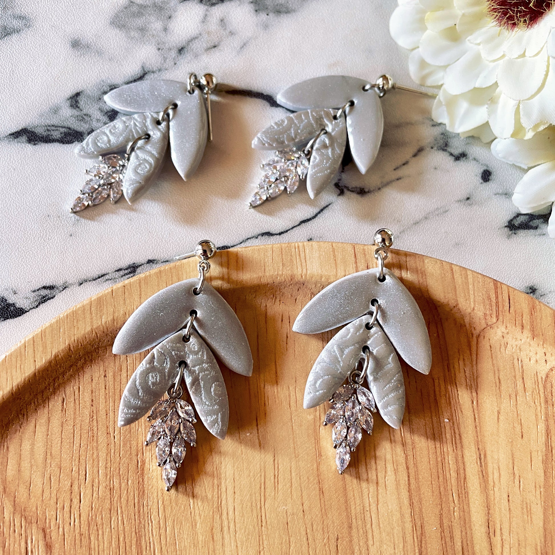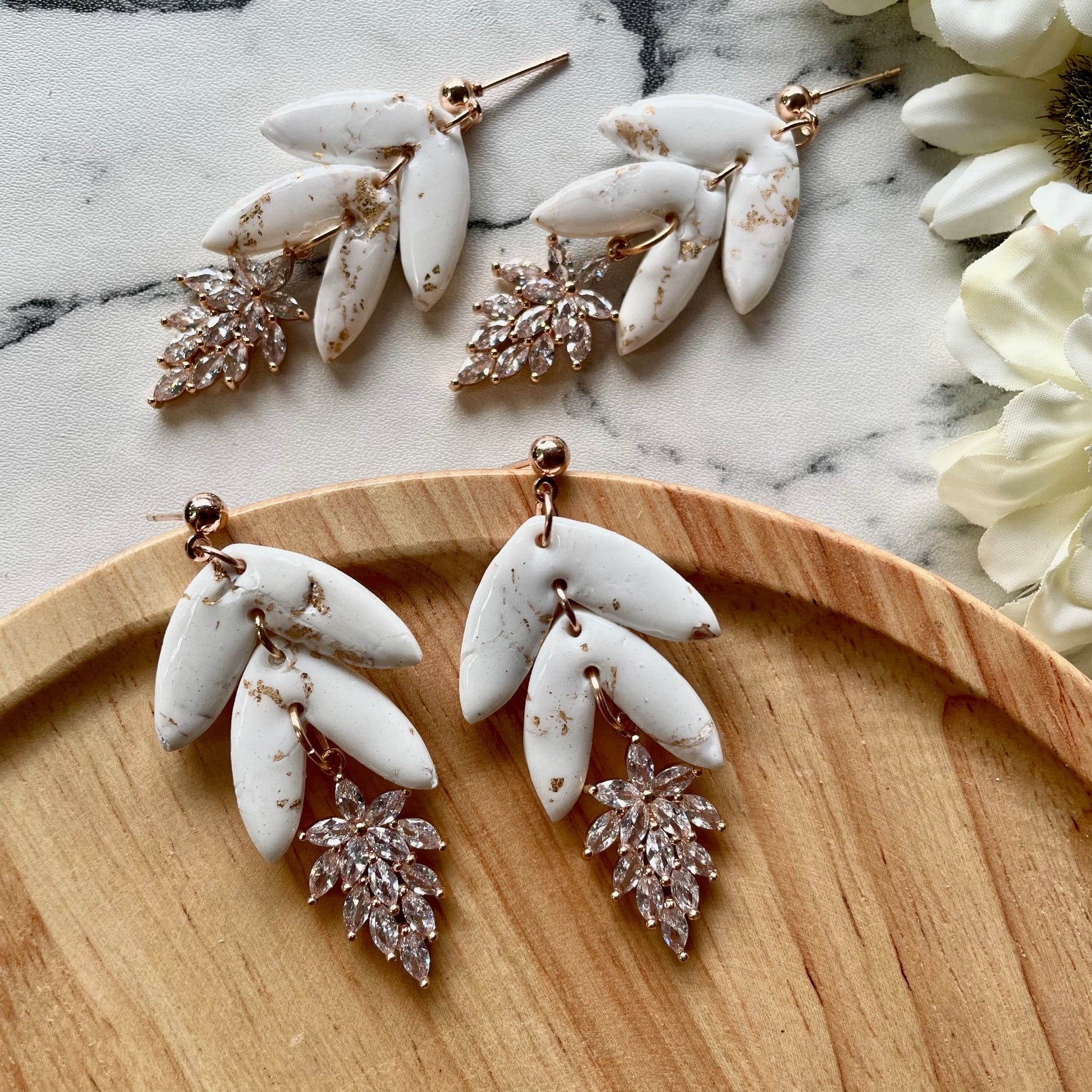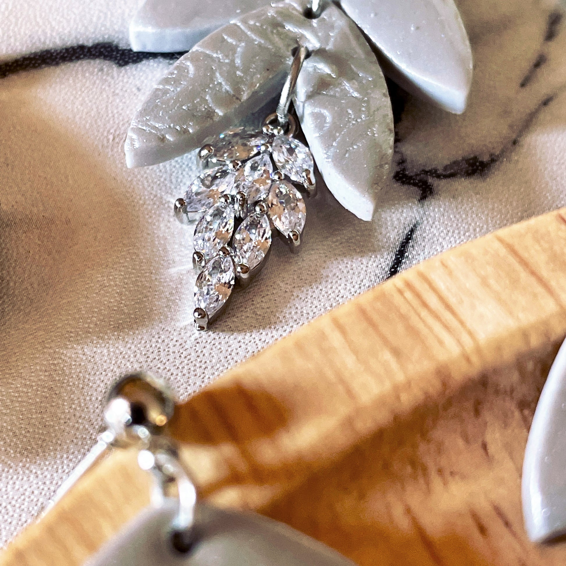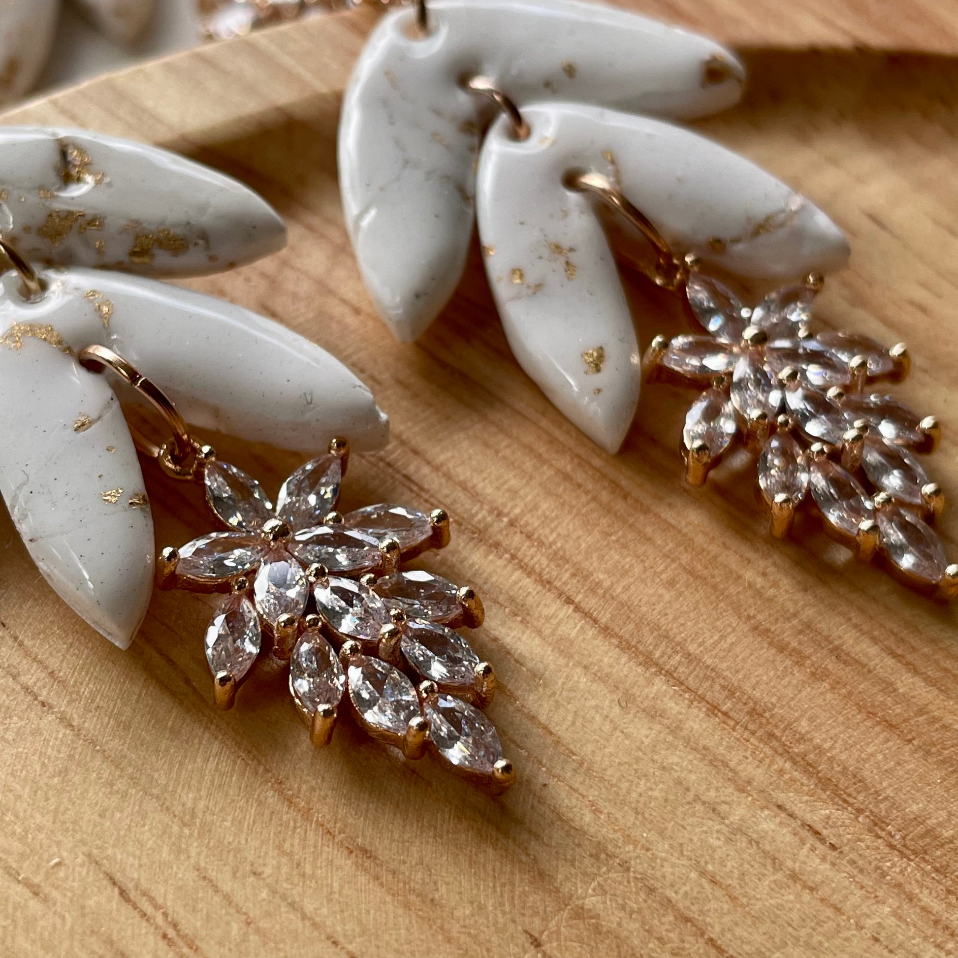 Statement drop polymer clay earrings with cubic zirconia pendant.
