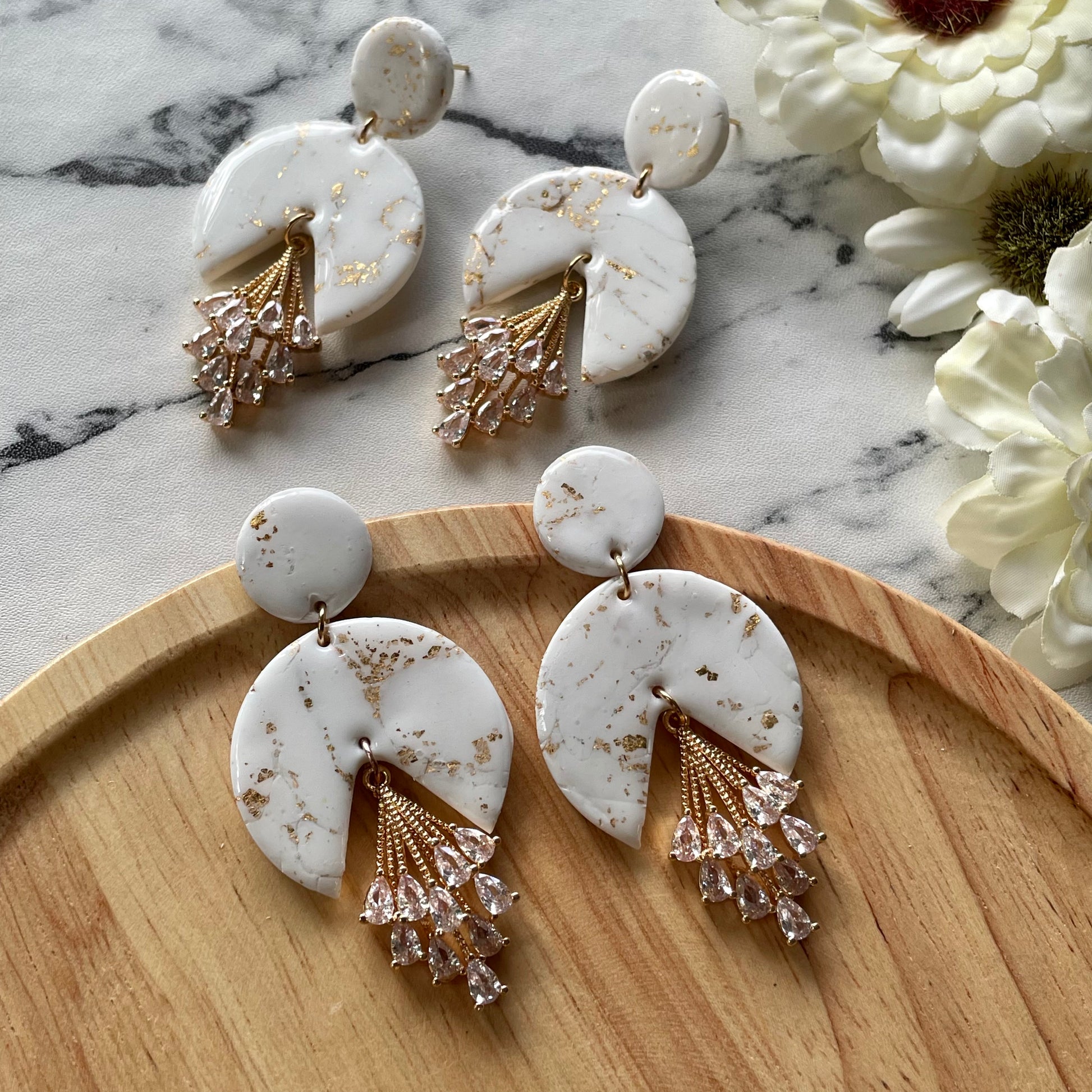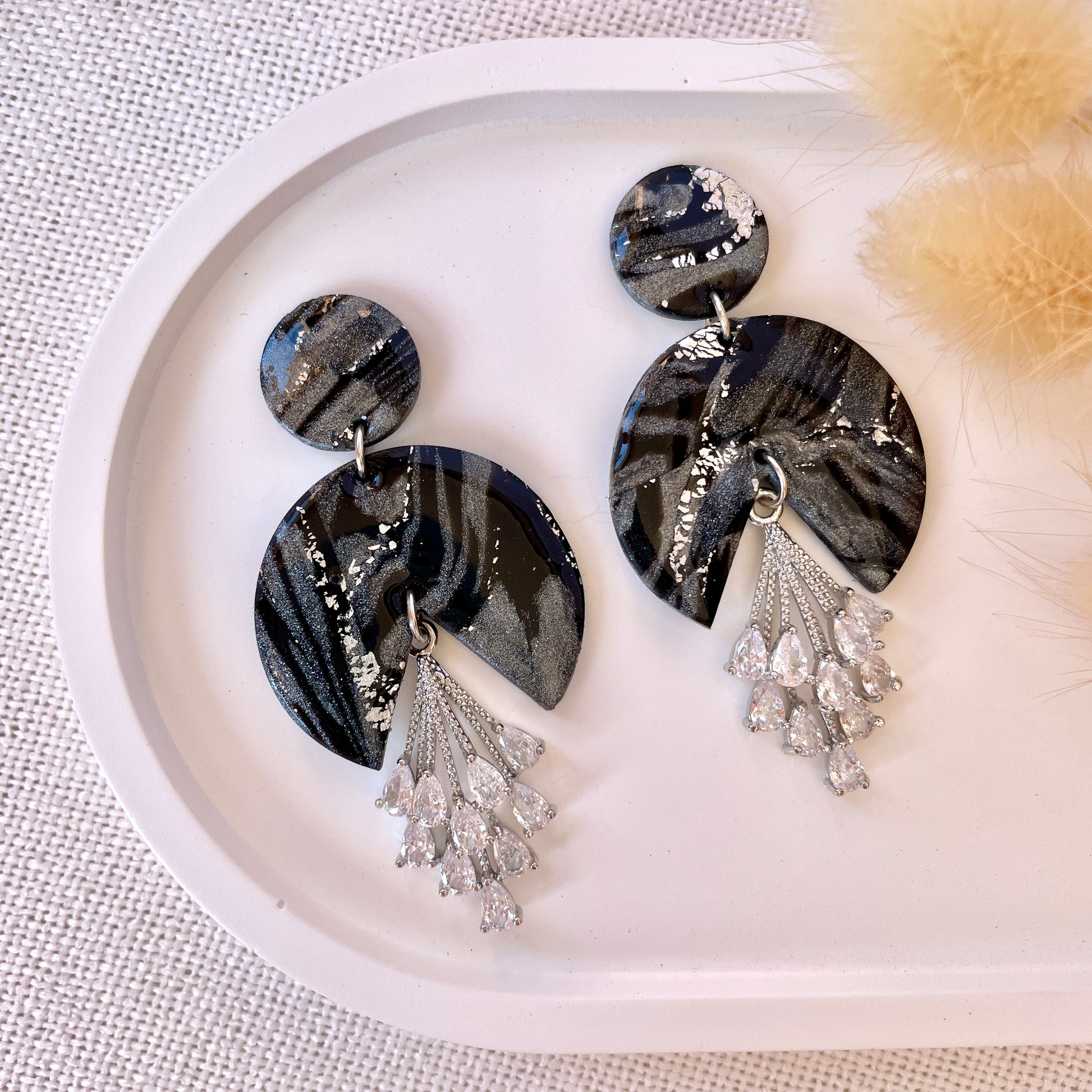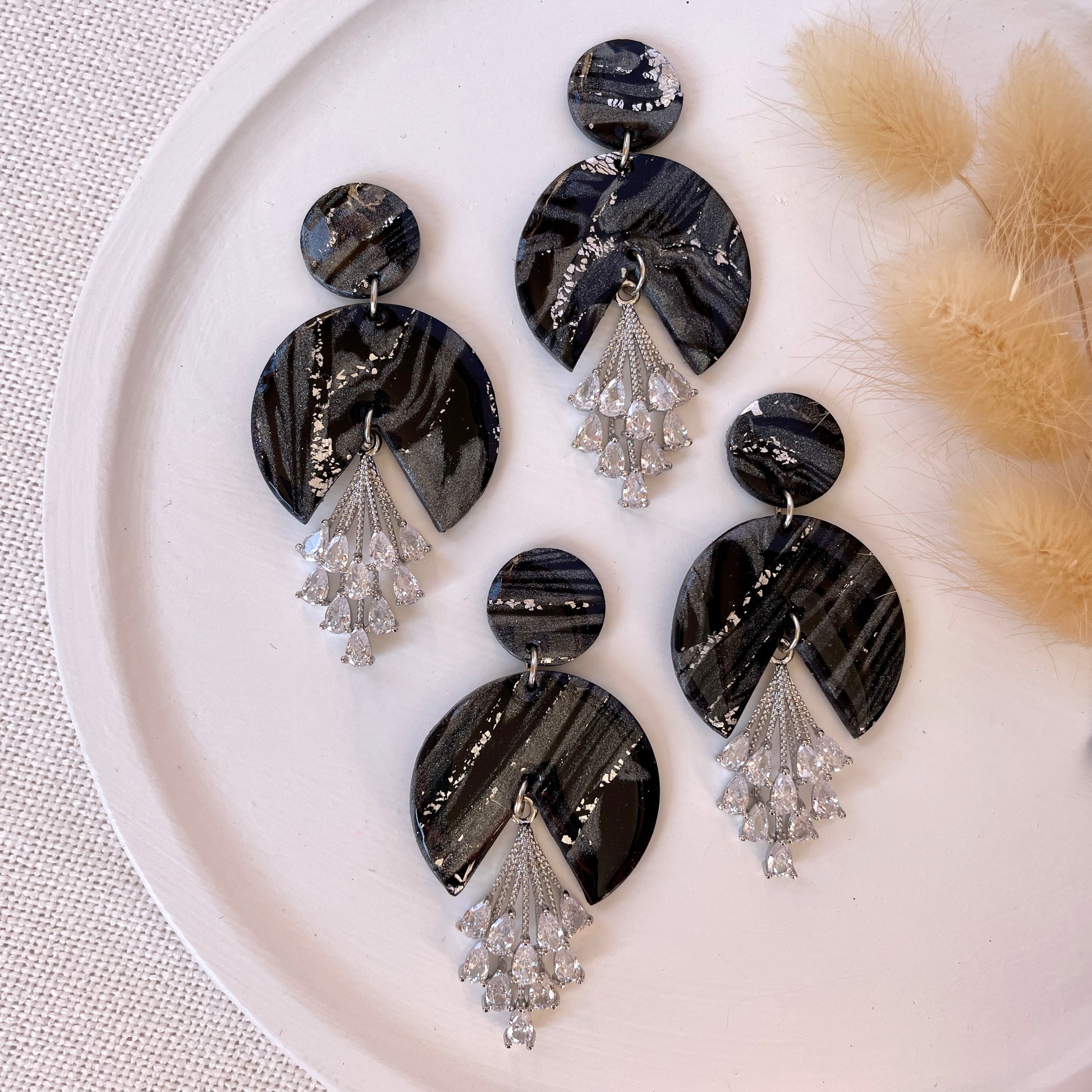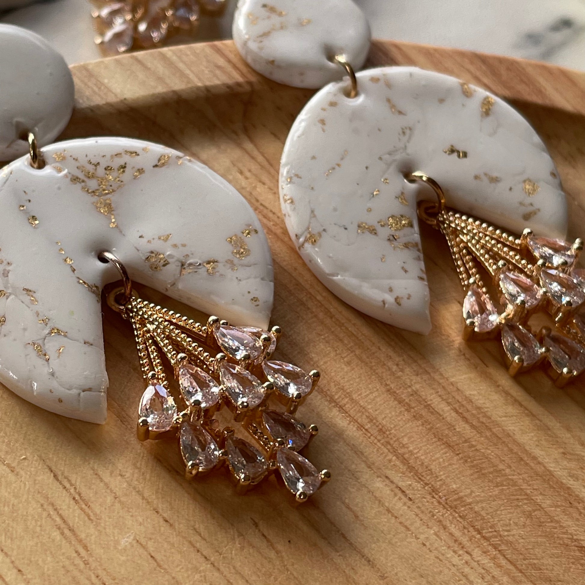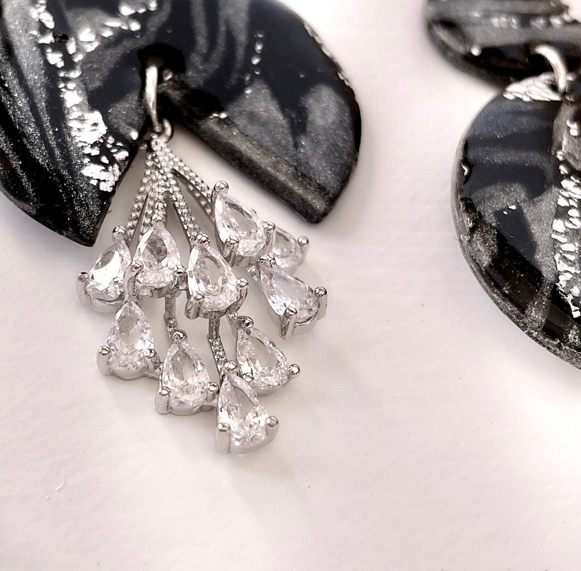 Statement drop polymer clay earrings with cubic zirconia pendant.