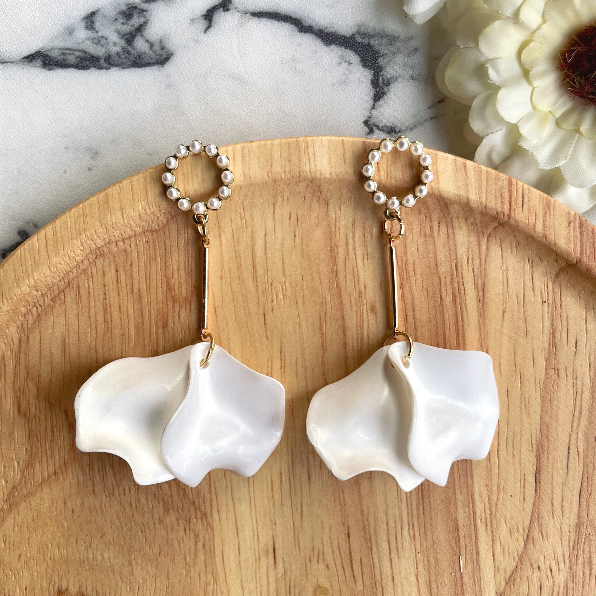 Statement rose petal earrings with pearl studs.